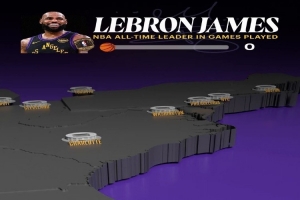 湖人官推晒出一段动画,以篮球数量代表詹姆斯生涯在北美各个城市或地区的出战比赛场数,回顾詹姆斯的生涯征战历程。
