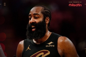 赛后骑士官方晒出本场赢球海报,封面人物为哈登。